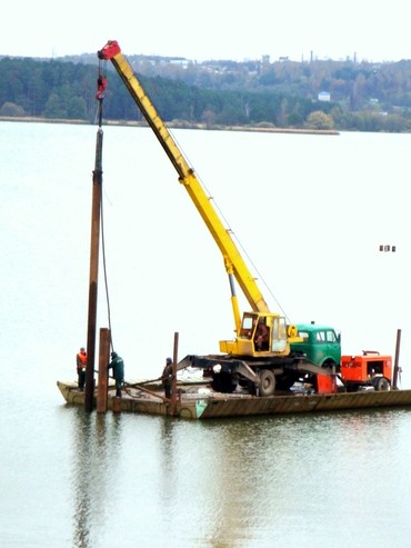 Комплект оборудования для погружения (забивки) свай, шпунта (Д=159-426 мм, длиной до 18 м) в стесненных условиях. На вылете стрелы до 20м. В дно водоема. Из подвала здания. Там, где невозможно использовать обычную сваебойную технику.